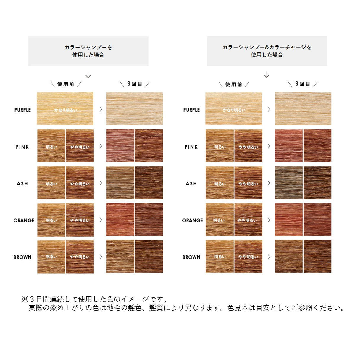 また、「カラーシャンプーやカラートリートメントを使った直後にサロンカラーをすると、色素の影響で思い通りの色になりにくい……」という心配が少なく、サロンカラーの直前まで使用していただけます。