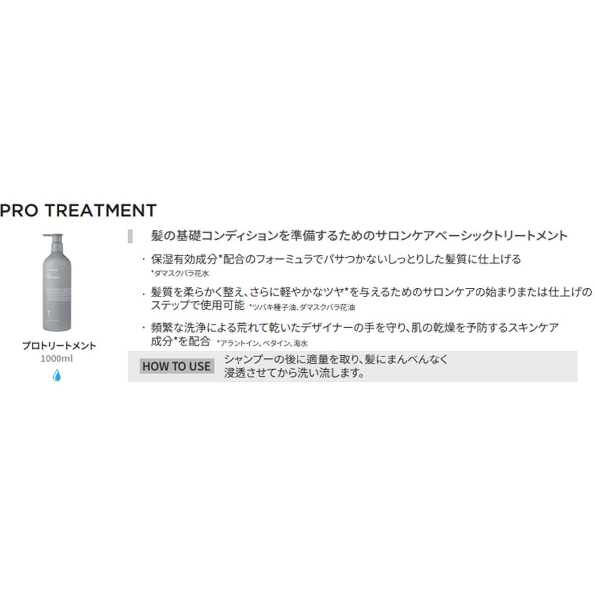 水、グリセリン、ジメチコン、DPG、セタノール、ステアリルアルコール、ベヘントリモニウムクロリド、ベタイン、ツバキ種子油、ダマスクバラ花水、エチルヘキシルグリセリン、アラントイン、BG、ベニバナエキス、ダマスクバラ花油、ムラサキ根エキス、トウガラシ果実エキス、β-カロチン、海水、水添ポリイソブテン、カプリリルグリコール、トリイソステアリン酸ポリグリセリル-2、バクガエキス、ヒドロキシプロピルデンプンリン酸、EDTA-2Na、デキストリン、トコフェロール、イソプロパノール、プロパンジオール、1,2-ヘキサンジオール、トリ(カプリル酸/カプリン酸)グリセリル、リナロール、ヘキシルシンナマル、ヒドロキシシトロネラール、香料